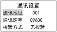 該功能設(shè)置控制裝置通訊參數(shù), 以便上位機(jī)可與其進(jìn)行數(shù)據(jù)通訊, 包含設(shè)備通訊地址(1~255)、通訊波特率(2400、4800、9600、19200)、校驗(yàn)方式(奇校驗(yàn)、偶校驗(yàn)、無(wú)校驗(yàn)) 設(shè)置。注意: 在同一個(gè) RS485 網(wǎng)絡(luò)中設(shè)備通訊地址不能重復(fù)。用戶(hù)按“SET”鍵使相應(yīng)數(shù)值進(jìn)入修改狀態(tài), 在此狀態(tài)下, 通過(guò)