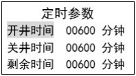 該菜單用于設(shè)置定時(shí)制度下的自動(dòng)開(kāi)關(guān)井時(shí)間及剩余時(shí)間, 設(shè)置范圍 1~ 32767 分鐘。