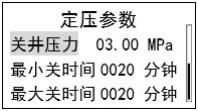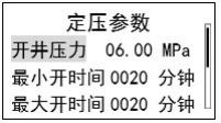 該菜單用于設(shè)置定壓制度下的自動(dòng)開(kāi)關(guān)井壓力及最大最小開(kāi)關(guān)井時(shí)間, 壓力范圍 0~99.99MPa。